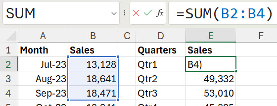 The reference to cell B5 however is correct. That is the starting cell we need for the next quarter. What many people don't realise is you can edit a range and change the starting cell to the ending cell and when you press Enter Excel will correct the range reference automatically. See image below.