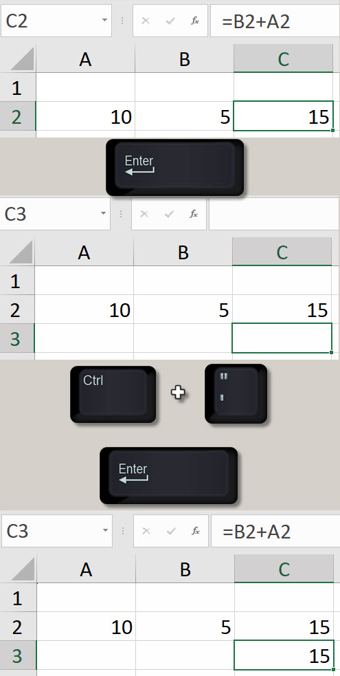 Formula copy - the previous technique is a way to copy the formula from the above cell without any references changing – see image below.