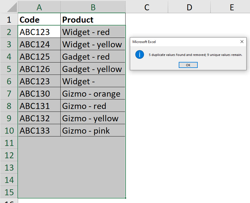 You are told how many duplicates were removed and how many entries remain. Click OK to clear the message box.