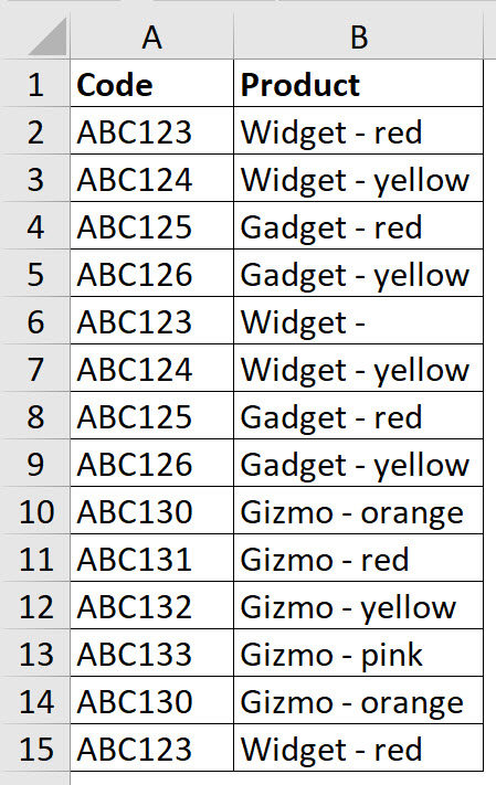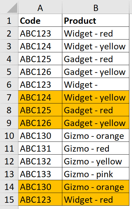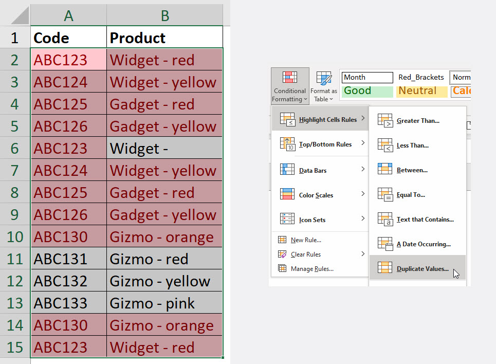 Excel has a built-in Duplicates conditional format, but it works based on cell entries, not entries across columns. We want to base the conditional format across two columns.