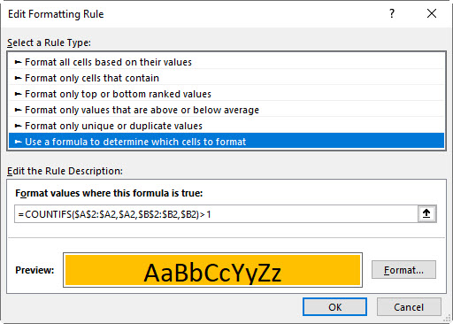 =COUNTIFS($A$2:$A2,$A2,$B$2:$B2,$B2)>1 Click the Format button and choose a fill colour from the Fill tab – I chose Orange. Click OK.