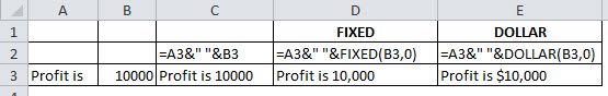 Similar to the FIXED function, but it also includes the $ sign with the number. The formula for cell E3 is