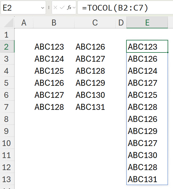 In our case we need to identify the unique entries from each of the cells. We can use the TOCOL function to convert the range into a column of entries.